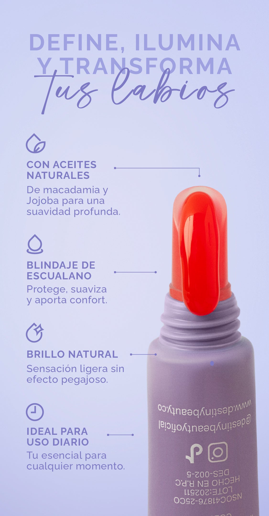 Úsalo solo para un look fresco, encima de tu labial para un efecto más jugoso, o como tu aliado de diario cuando tus labios piden auxilio.